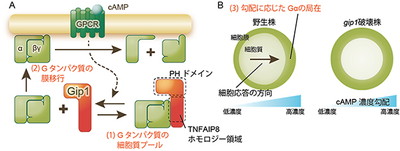 このような三量体Gタンパク質の局在調節という新たなメカニズムを用いることで、走化性細胞は適切に濃度勾配を認識し、応答範囲を拡張することが明らかになった。