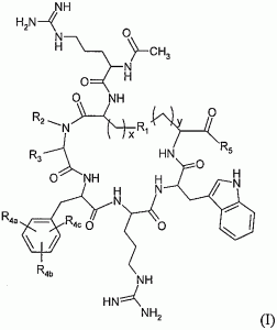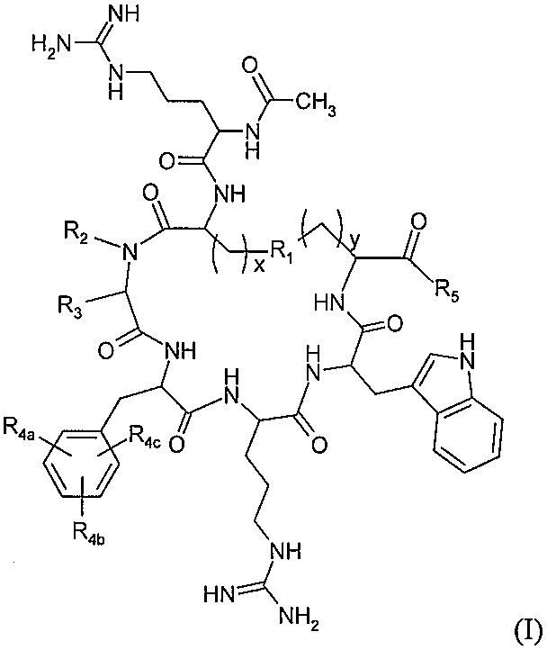 本発明は、式(I)のメラノコルチン受容体特異的な環状ペプチドまたはその医薬的に許容できる塩に関するものであり、式中のR1、R2、R3、R4a、R4b、R4c、R5、xおよびyは明細書中に定めたものである。これらの化合物は、エネルギー恒常性および代謝関連(たとえば糖尿病)、摂食関連および/またはエネルギーバランスおよび体重関連の疾患、障害および/または状態の処置に特に有用であり、これには肥満症、過体重、ならびに肥満症および/または過体重に関連する疾患、障害および/または状態、たとえば2型糖尿病およびメタボリックシンドロームが含まれる。