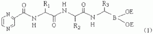 トリペプチドボロン酸又はトリペプチドボロン酸エステル、その調製方法及び使用 Posted on 2012/11/30 by bio 【公表番号】特表2012-530085 【公表日】平成24年11月29日(2012.11.29) 【出願人】北京大学 【要約】 本発明は、式(I)により表されるトリペプチドボロン酸又はトリペプチドボロン酸エステルのプロテアソーム阻害剤、その調製方法及び使用を開示する。プロテアソーム阻害剤は、悪性腫瘍、多数種の神経系変性疾患、筋悪液質、又は糖尿病を治療するための治療剤であり、ここで悪性腫瘍は白血病、胃がん、肝臓がん又は上咽頭癌である。 【化1】