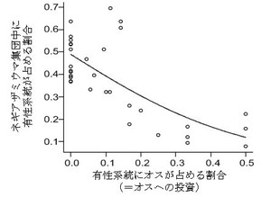 研究チームは、それぞれの系統の個体数を調べたところ、有性系統のオスが多くなるとネギアザミウマ集団内で有性系統個体が占める割合が低下することがわかった。つまり、有性系統が無性系統と競争する際にオスへの投資がコストになっているという。
